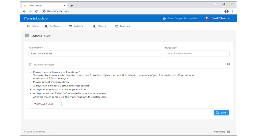 Choose which tennis ladder rules to use: proprietary point systems, win-replace, leap-frog... Fully customizable challenge & match rules -- only a few shown here.